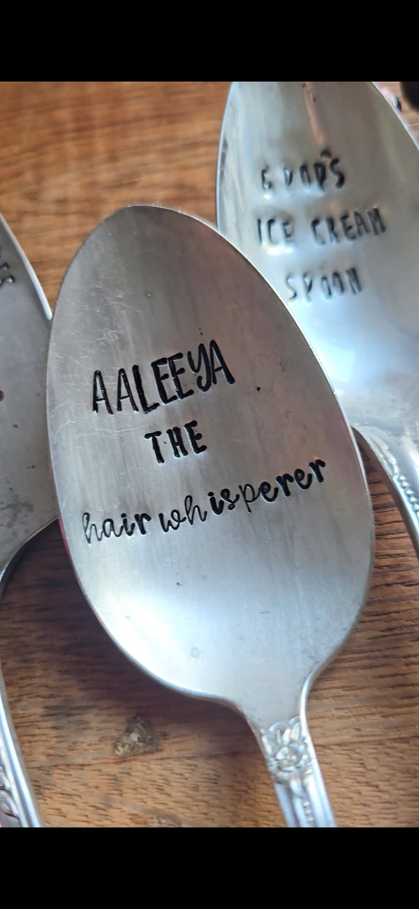 • This listing is for a vintage silver plated soup spoon that you can personalize. I stamp each letter one at a time! It will be sent to you packaged ready for you to gift it! customized spoon,stamped spoon,personalized spoon,vintage tea spoon,unique gift idea,clever gift idea,vintage spoon shop,texas spoon shop,texas small shop,custom gift, personalized gift,fathers day gift idea,gift idea for husband,gift idea for wife