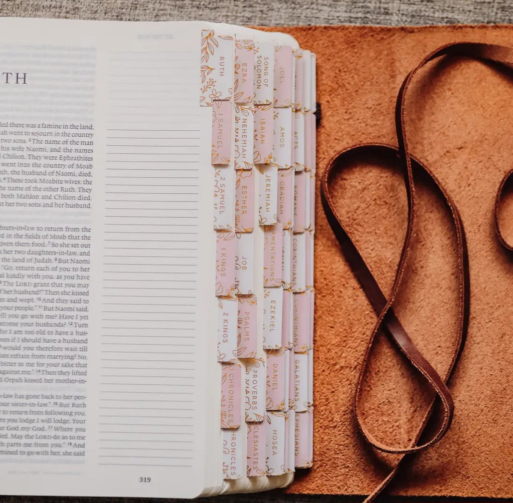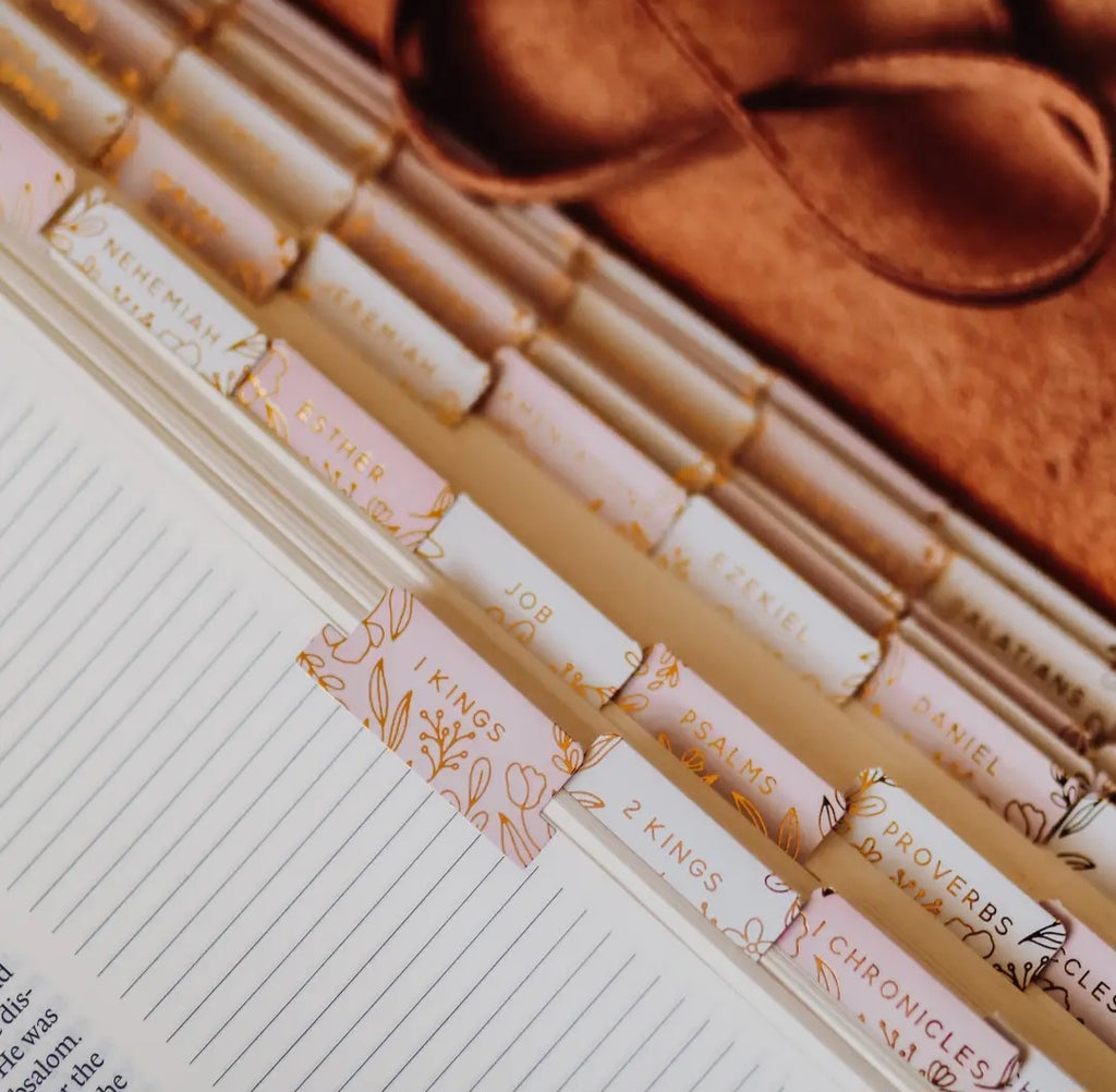 Organize your time in the word with these Gold Foil Bible Tabs in dusty pink. These are uniquely designed with a feminine flare and beautiful gold imprint.