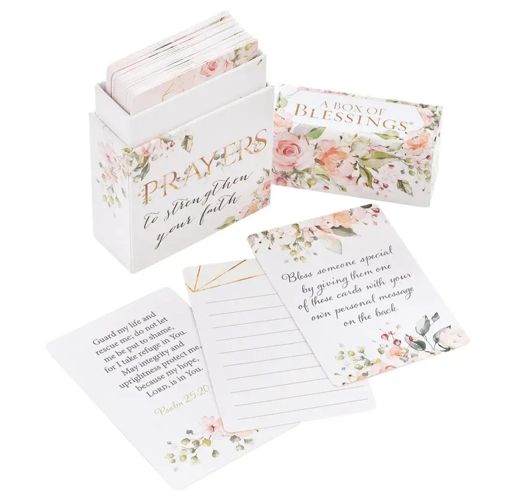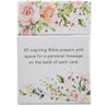 Soft blush pink palette floral design. Title printed in gold and black. Full color printed cards and box. 51 double-sided cards. Scripture based prayer on front, lined space on back. Sturdy box with lid.