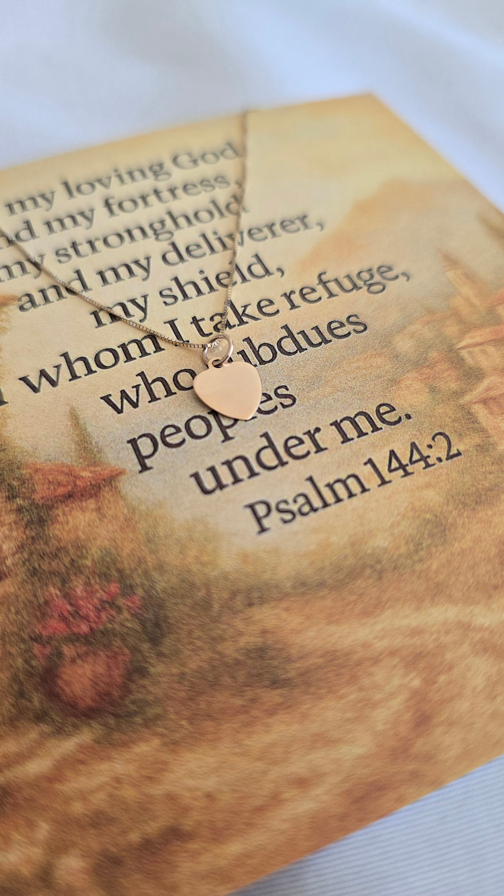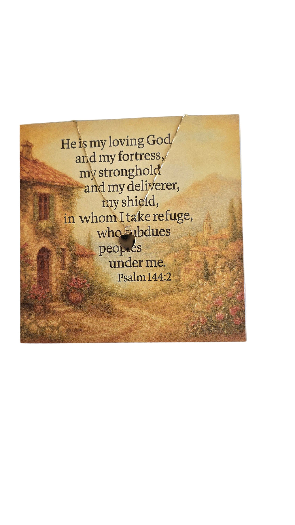 A tender reminder of God's unwavering protection and love,this gift set pairs a scripture card featuring Psalm 144:2 with a delicate gold necklace adorned with a dainty heart charm.