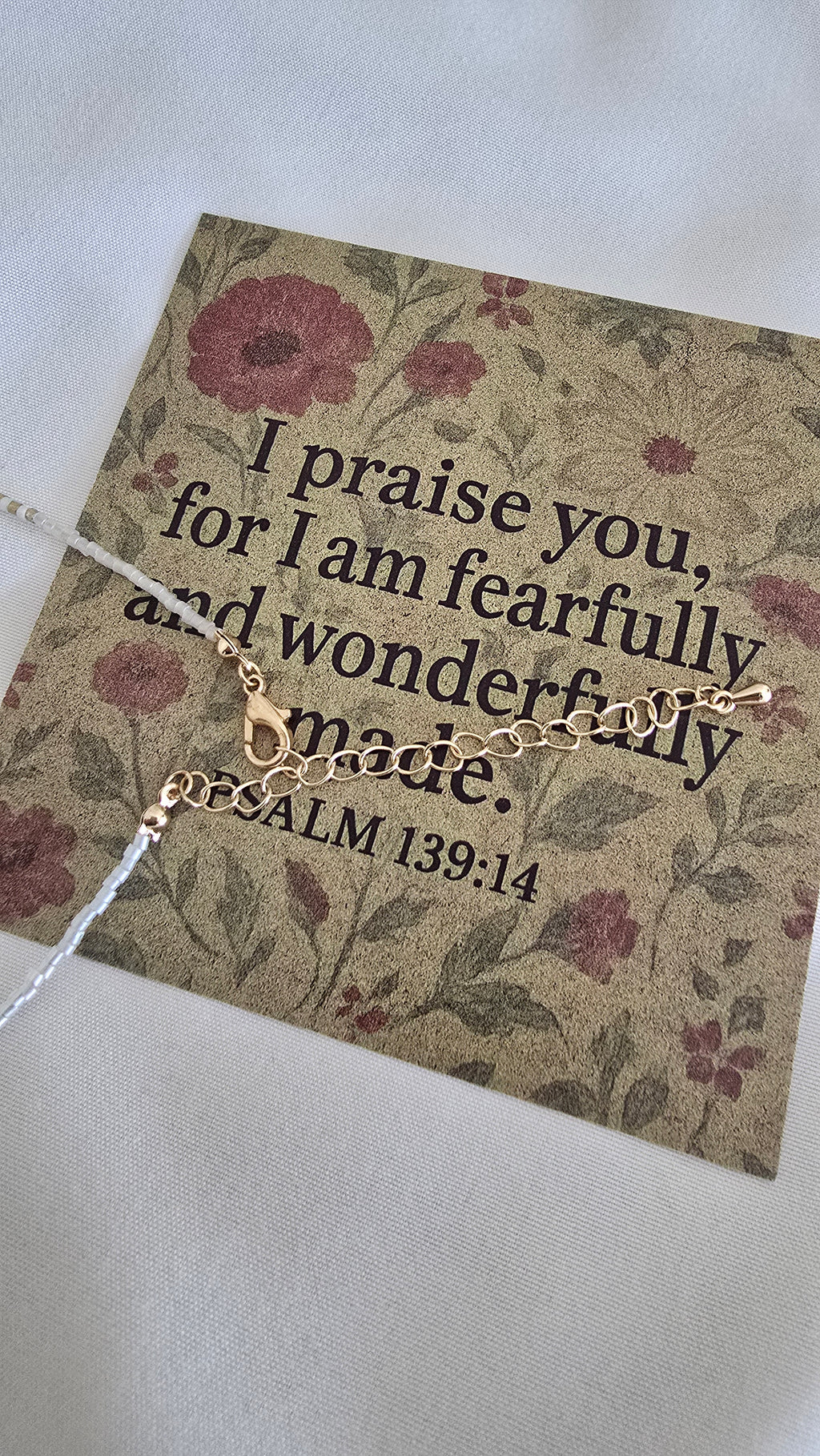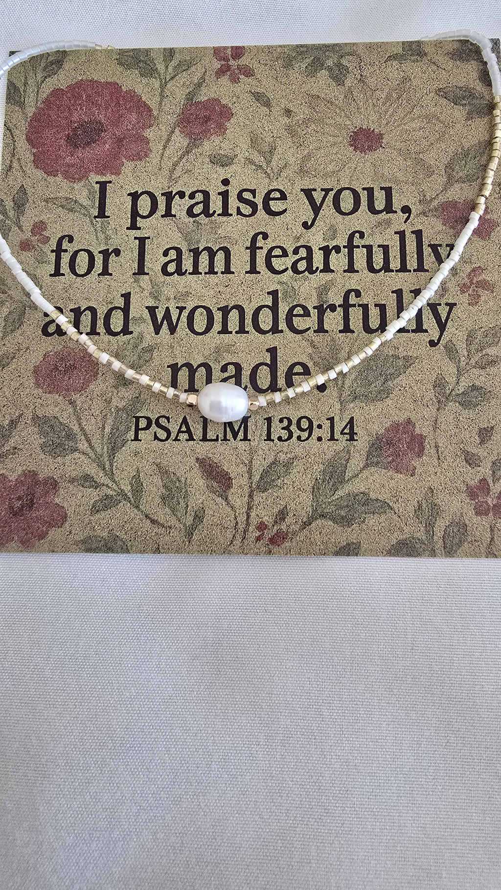 Wonderfully Made--Scripture Card and Seed Beaded Pearl Charm Necklace.