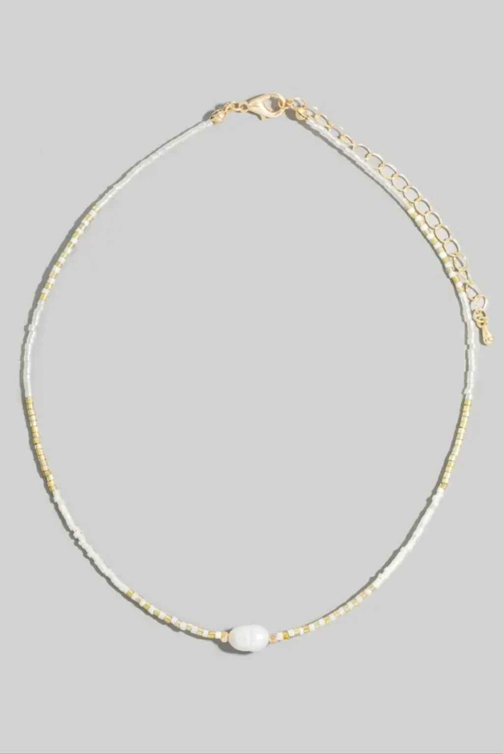 The seed beaded necklace features a delicate strand of neutral-toned beads and a single pearl charm-symbolizing purity, uniqueness, and the beauty of being handcrafted by God.