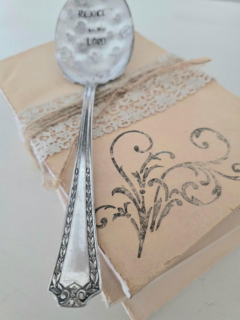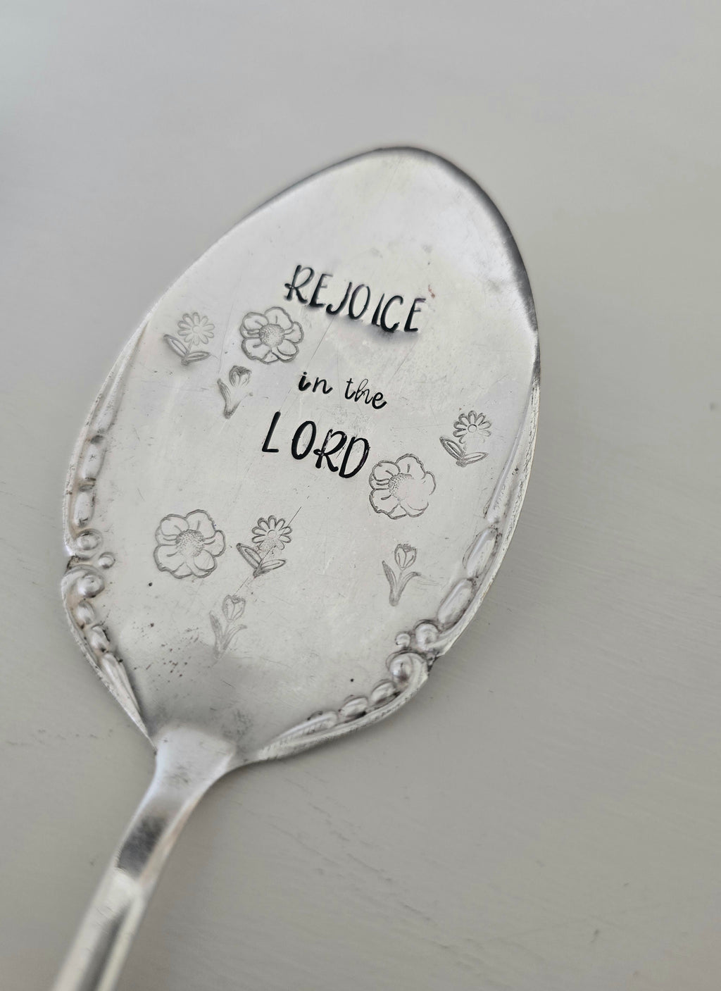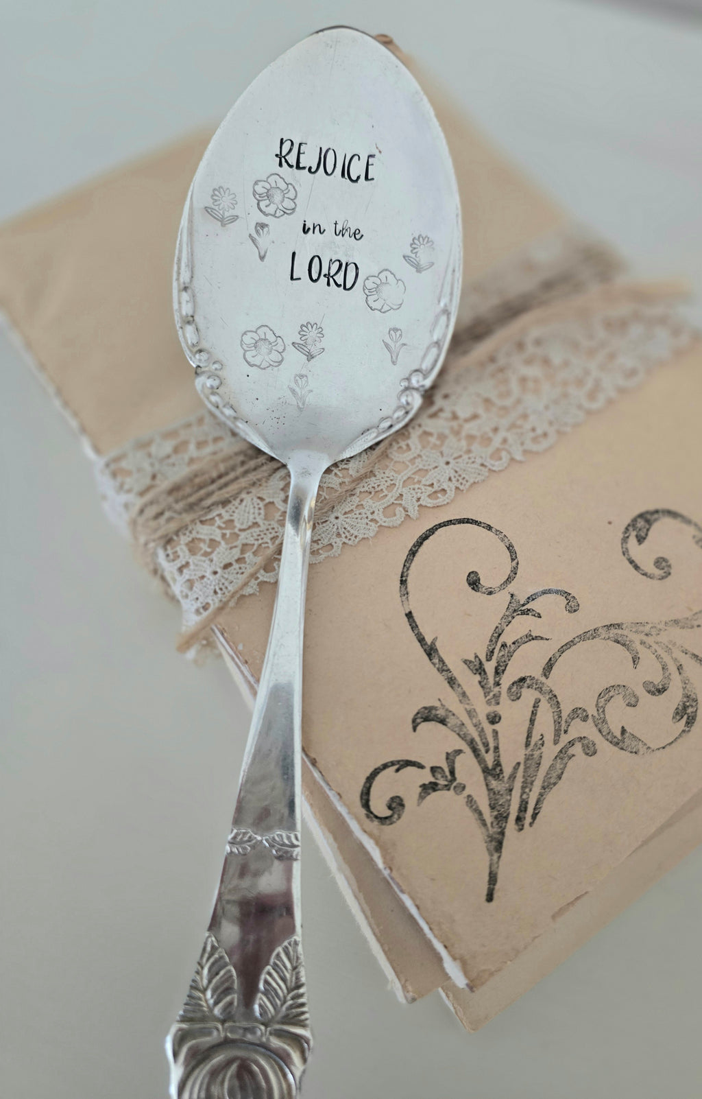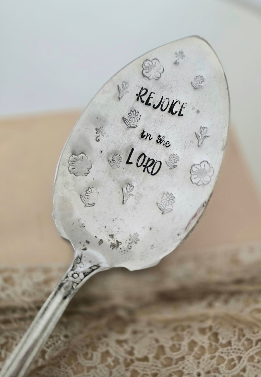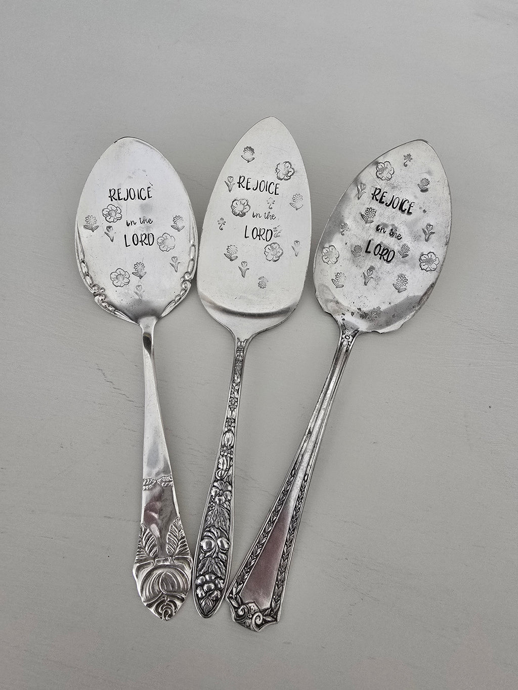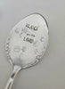 This item is a hand stamped vintage silver plated teaspoon that would make a lovely upcycled gift. It has been cleaned and polished as best to our ability. There are signs of use which leads to the uniqueness of this gift. The stamping is darkened with a food safe marker, but may eventually lighten with use. We highly suggest hand washing.
