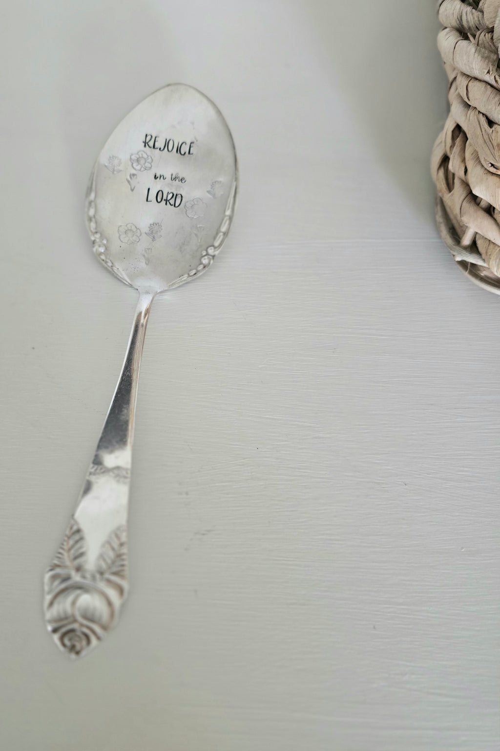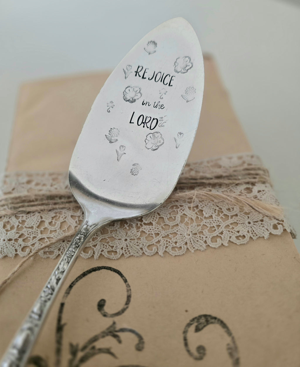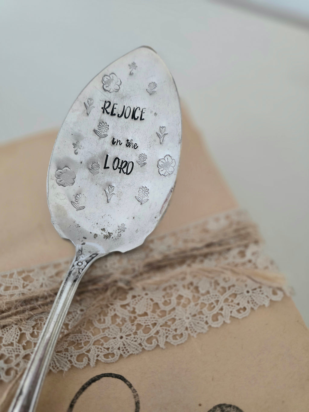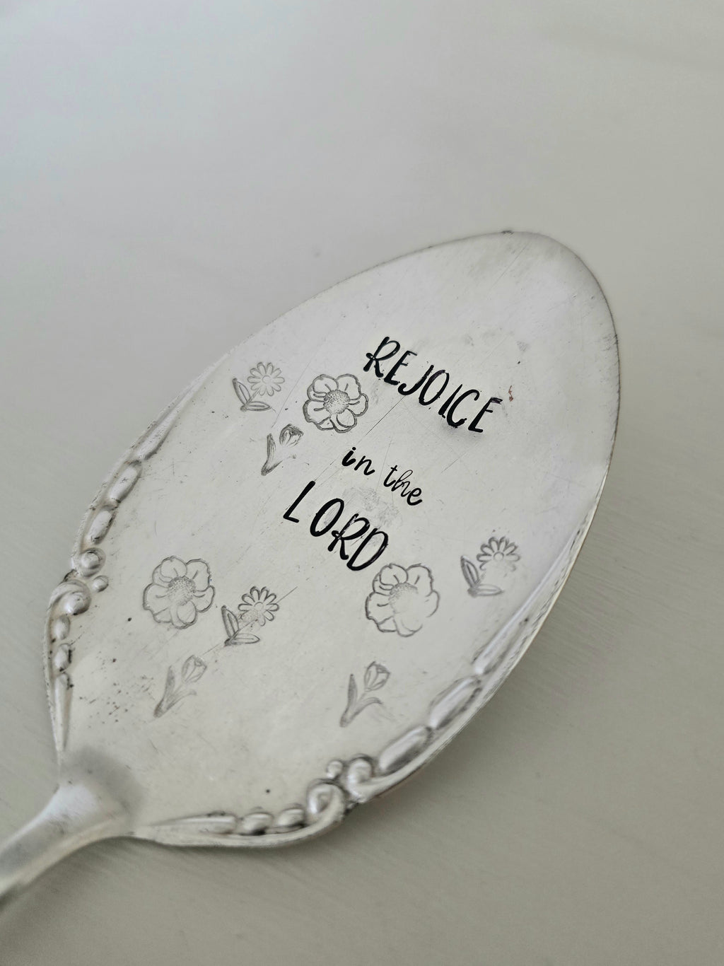 This item is a hand stamped vintage silver plated teaspoon that would make a lovely upcycled gift. It has been cleaned and polished as best to our ability. There are signs of use which leads to the uniqueness of this gift. The stamping is darkened with a food safe marker, but may eventually lighten with use. We highly suggest hand washing.