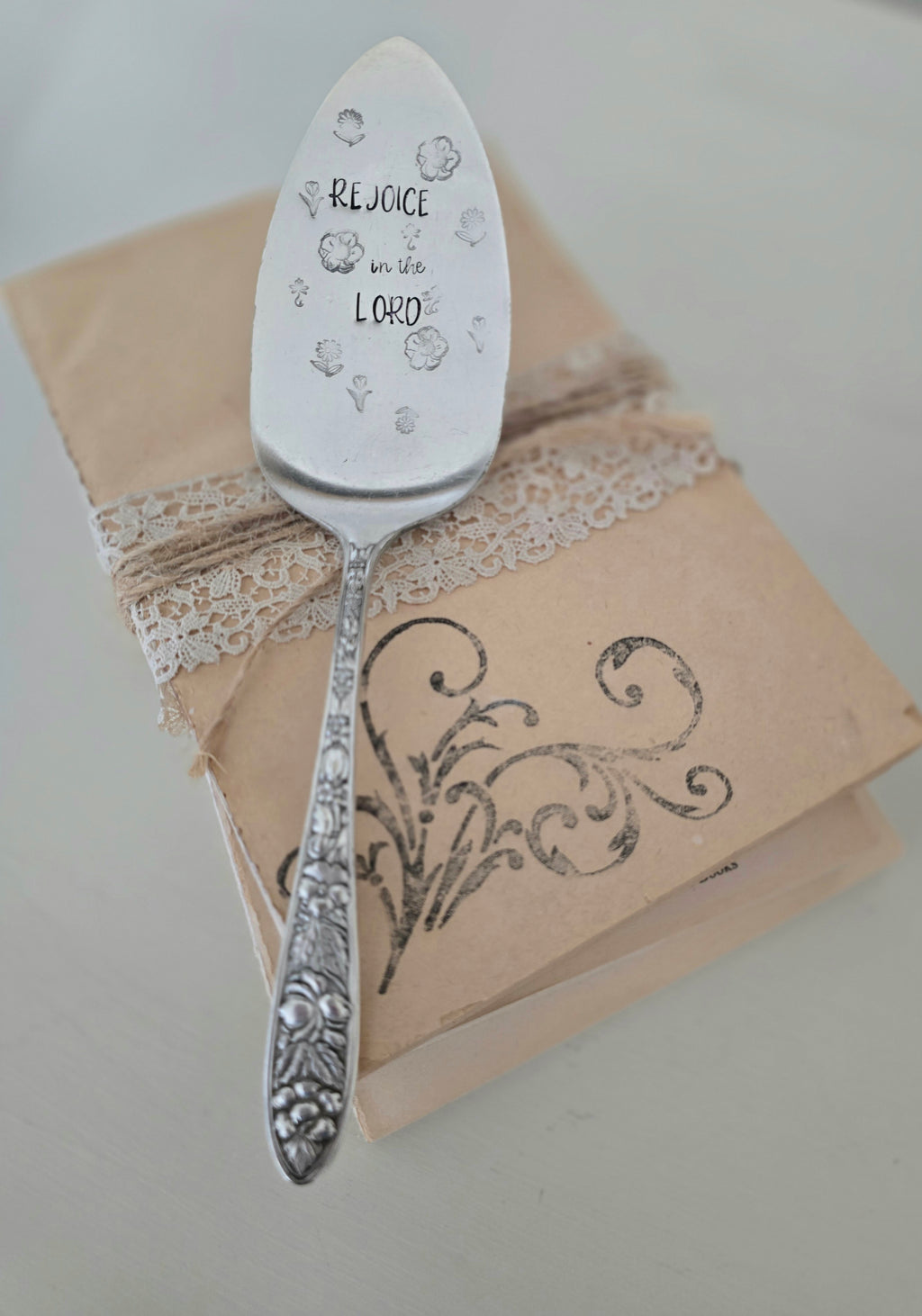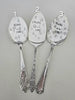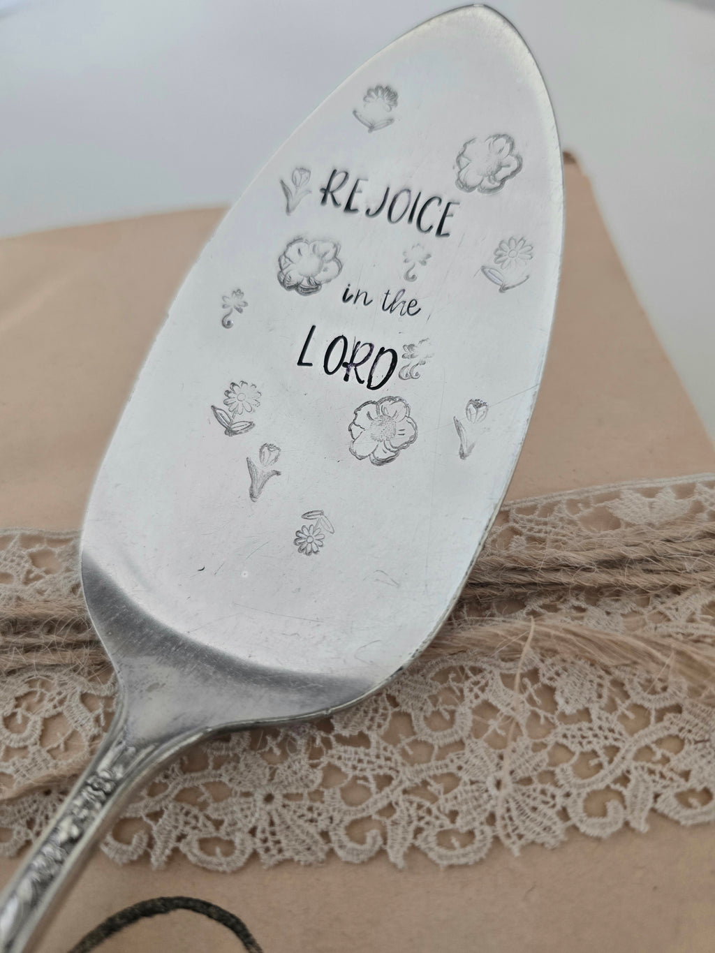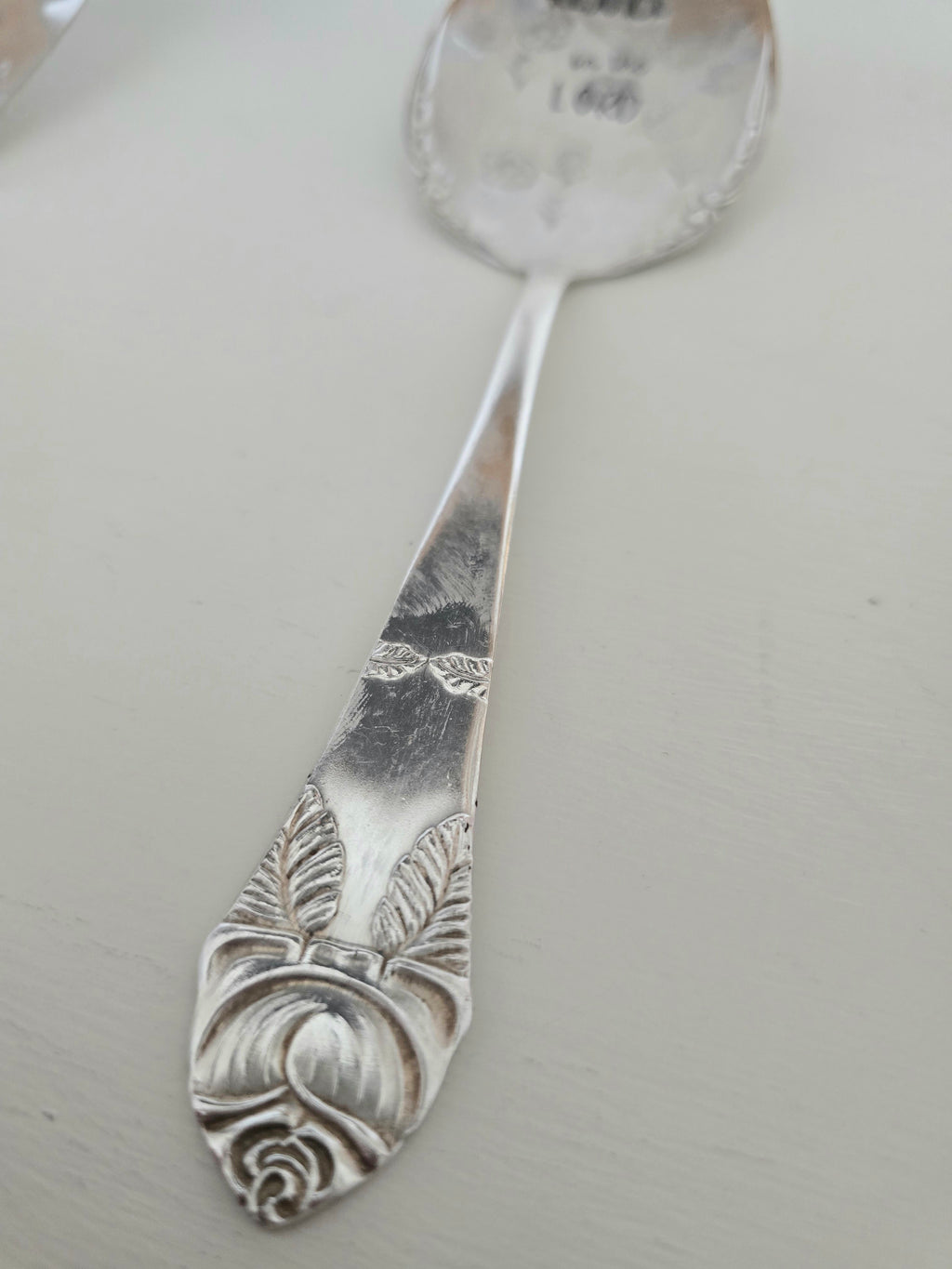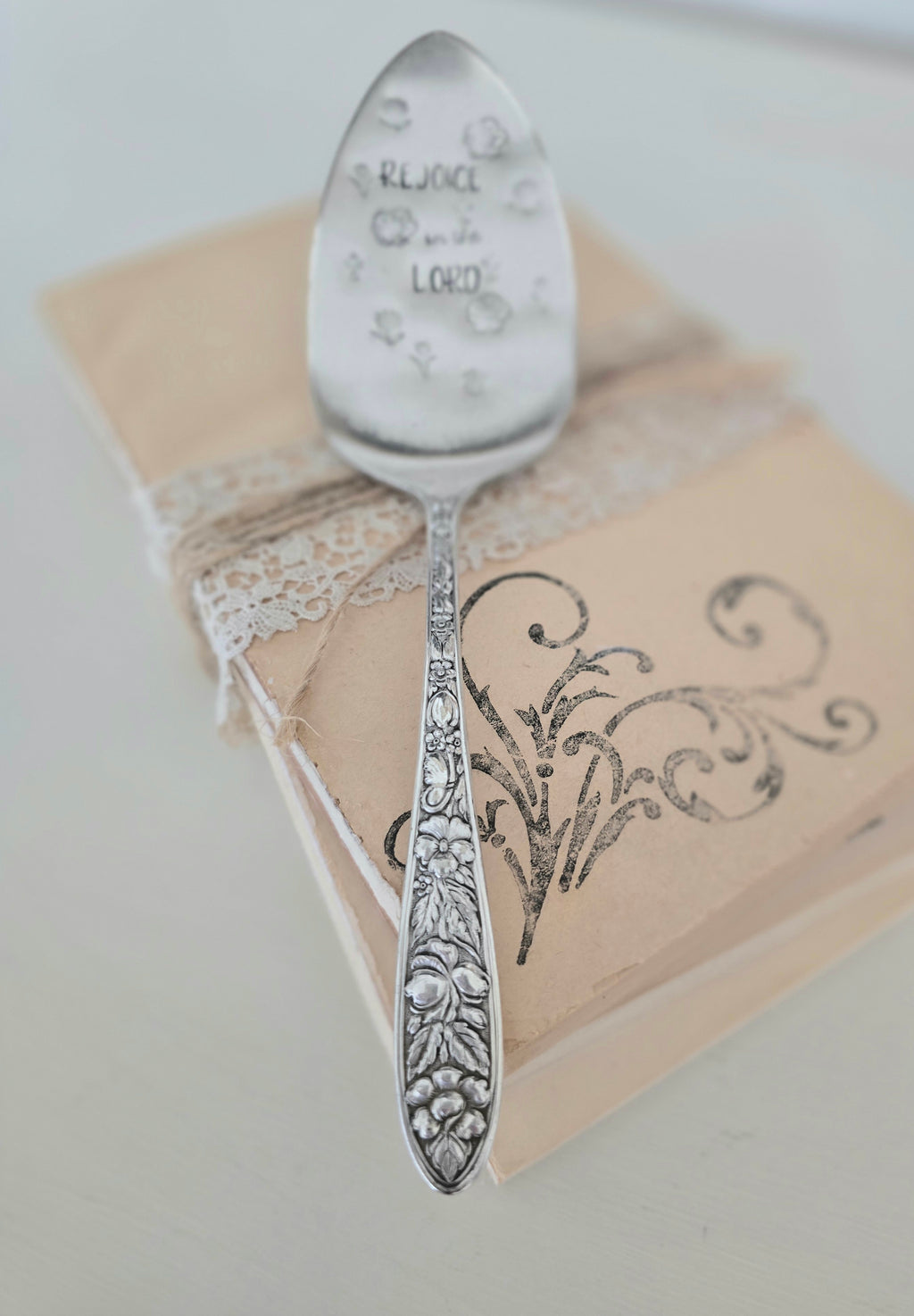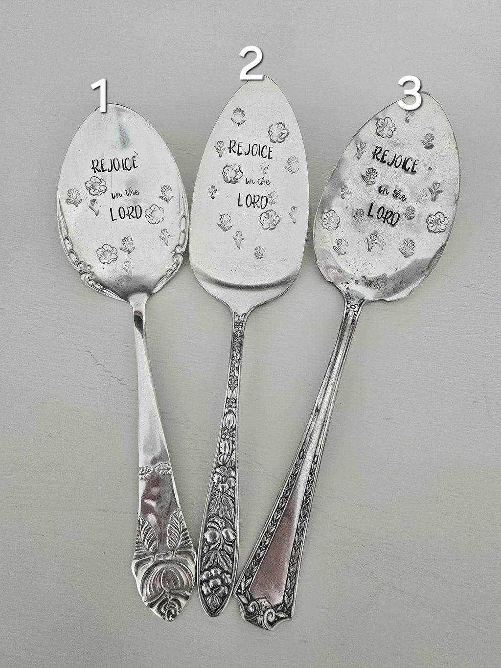 This item is a hand stamped vintage silver plated teaspoon that would make a lovely upcycled gift. It has been cleaned and polished as best to our ability. There are signs of use which leads to the uniqueness of this gift. The stamping is darkened with a food safe marker, but may eventually lighten with use. We highly suggest hand washing.