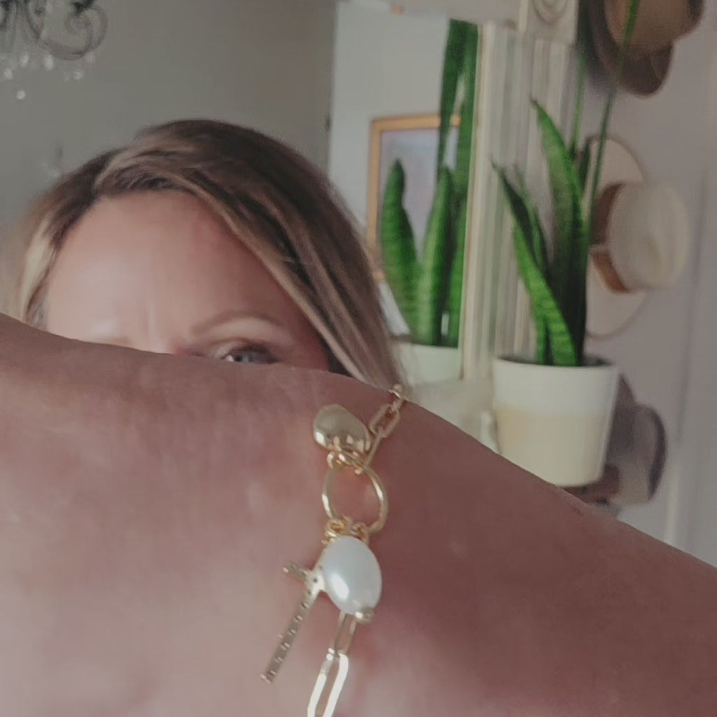 Gold dipped CZ cross,heart and Pearl charm bracelet.