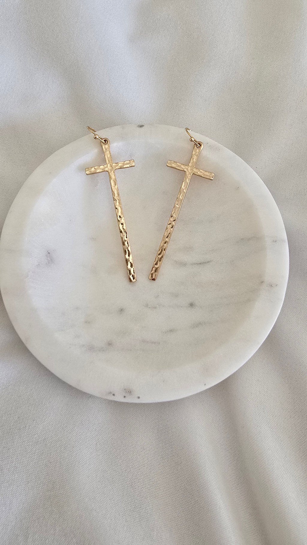 The hammered cross earrings feature a long, elegant silhouette with a textured finish--symbolizing strength, redemption, and the radiant joy of those who trust the Lord.