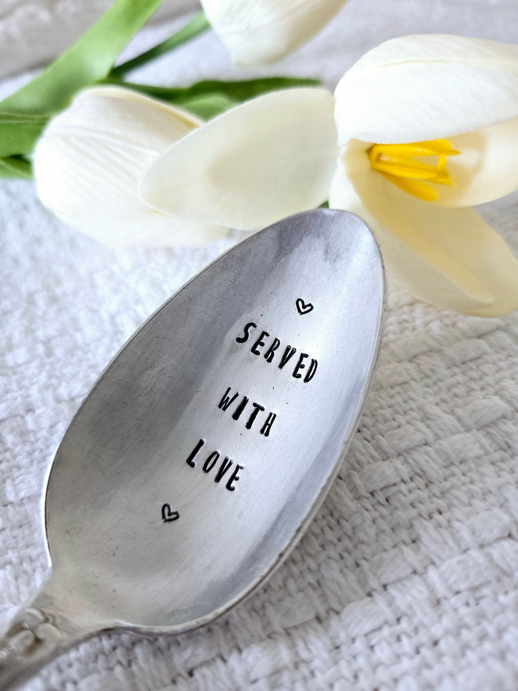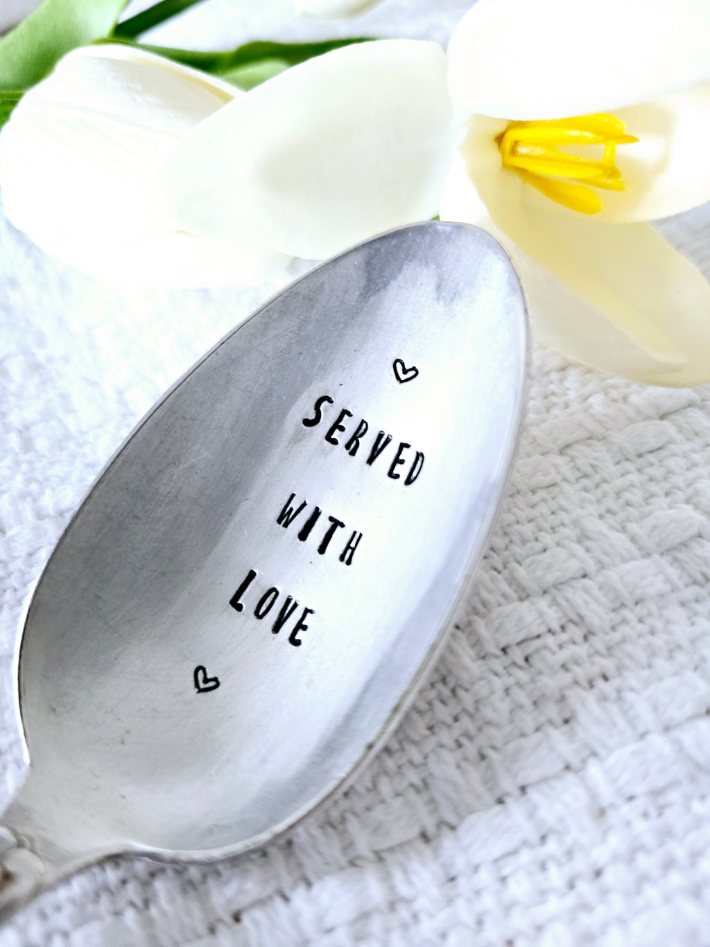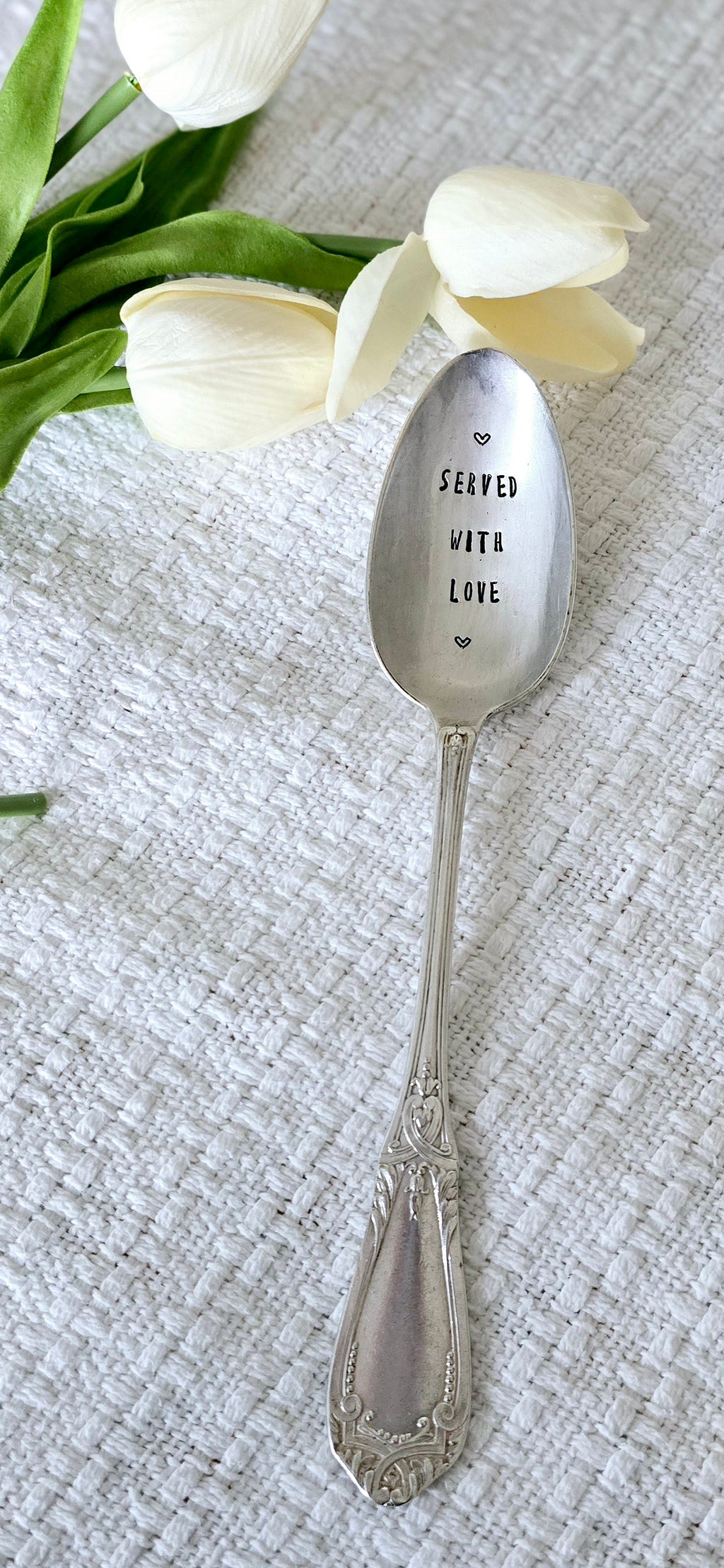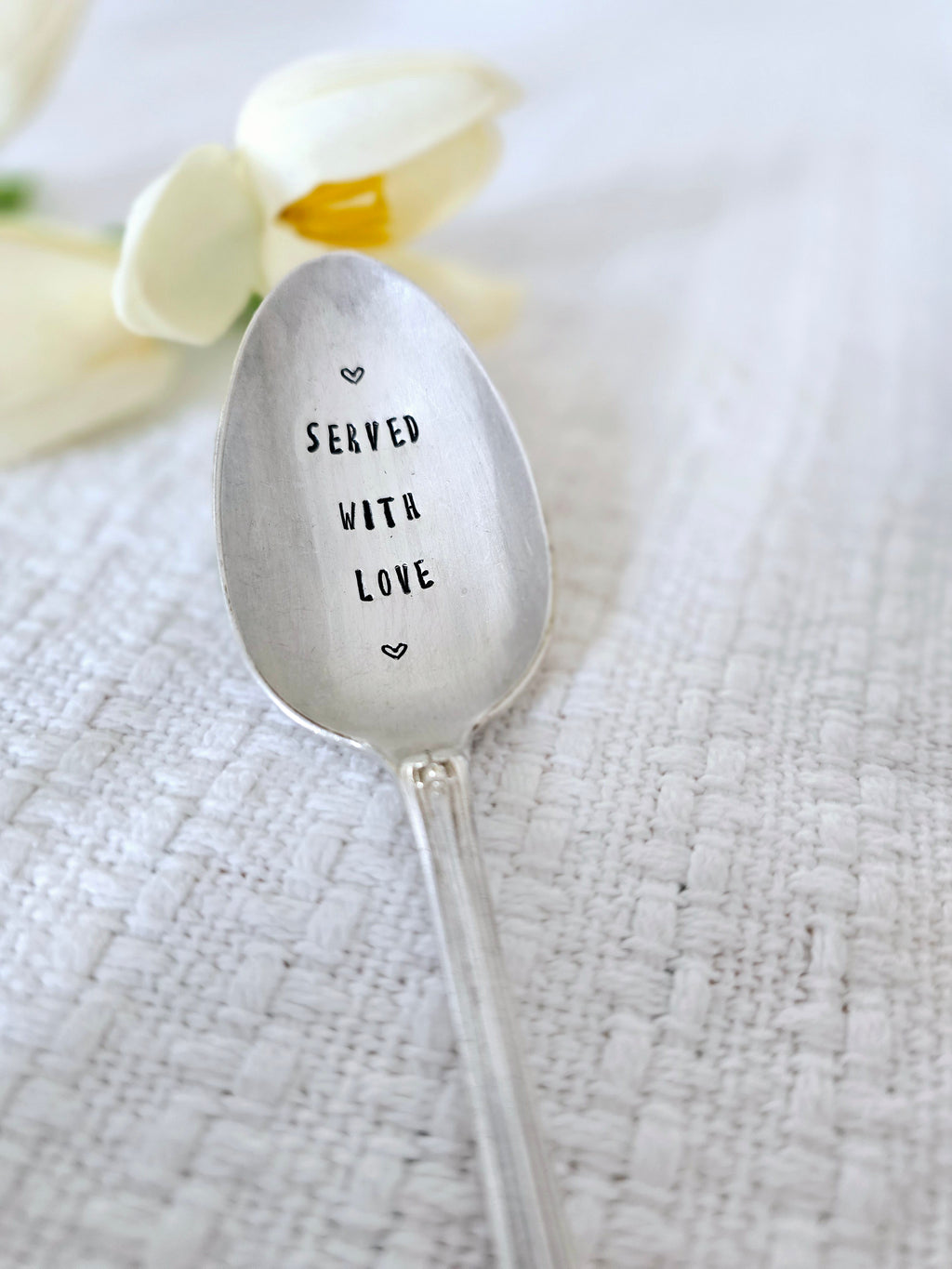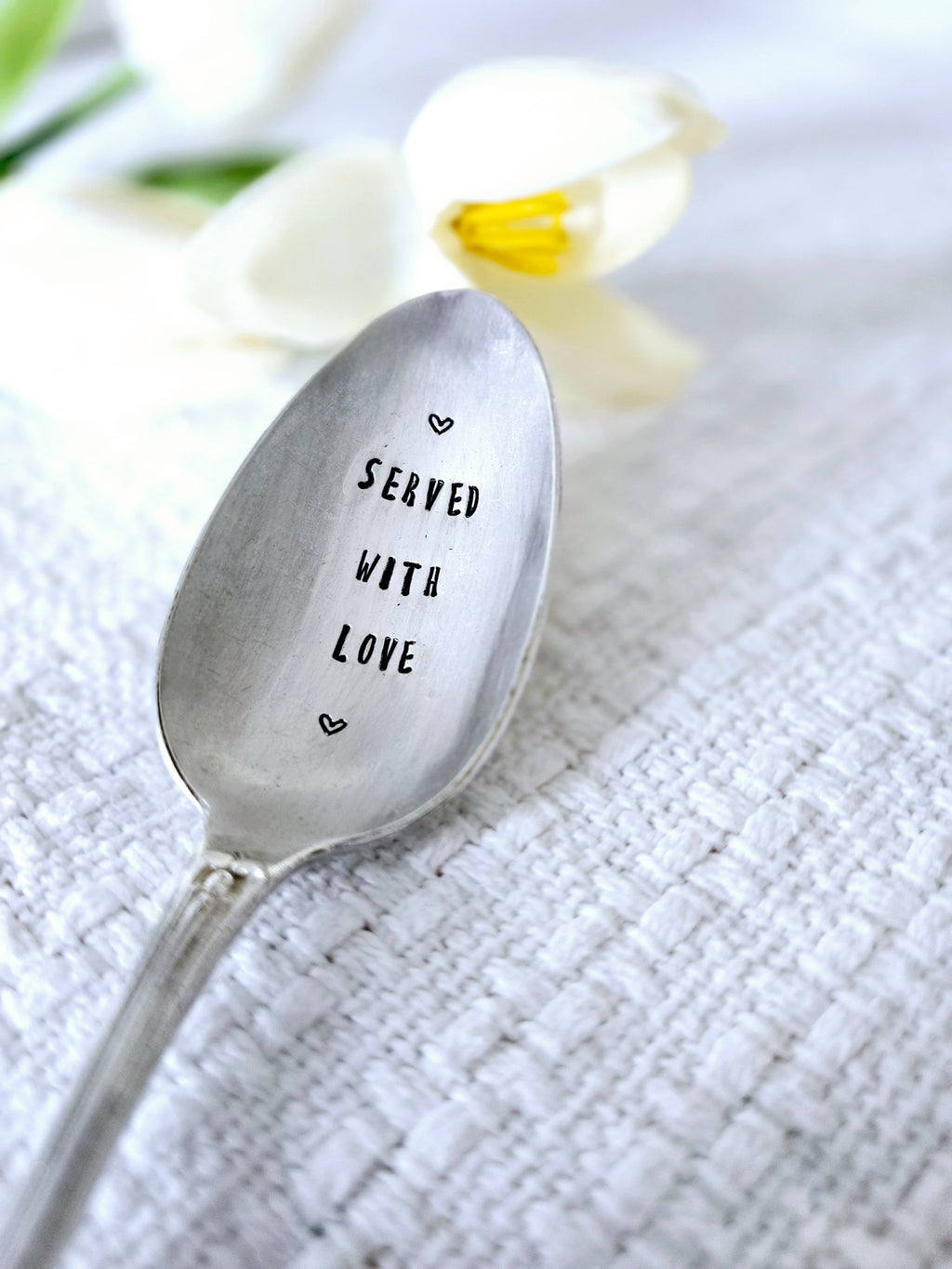 Every vintage piece is lovingly hand stamped by us one letter at a time to create a unique treasure for you. Because of that, it is impossible to guarantee that letters will be perfectly aligned. We believe this lends to the charm of each piece. There will be some tool markings on each side of the silver plate.