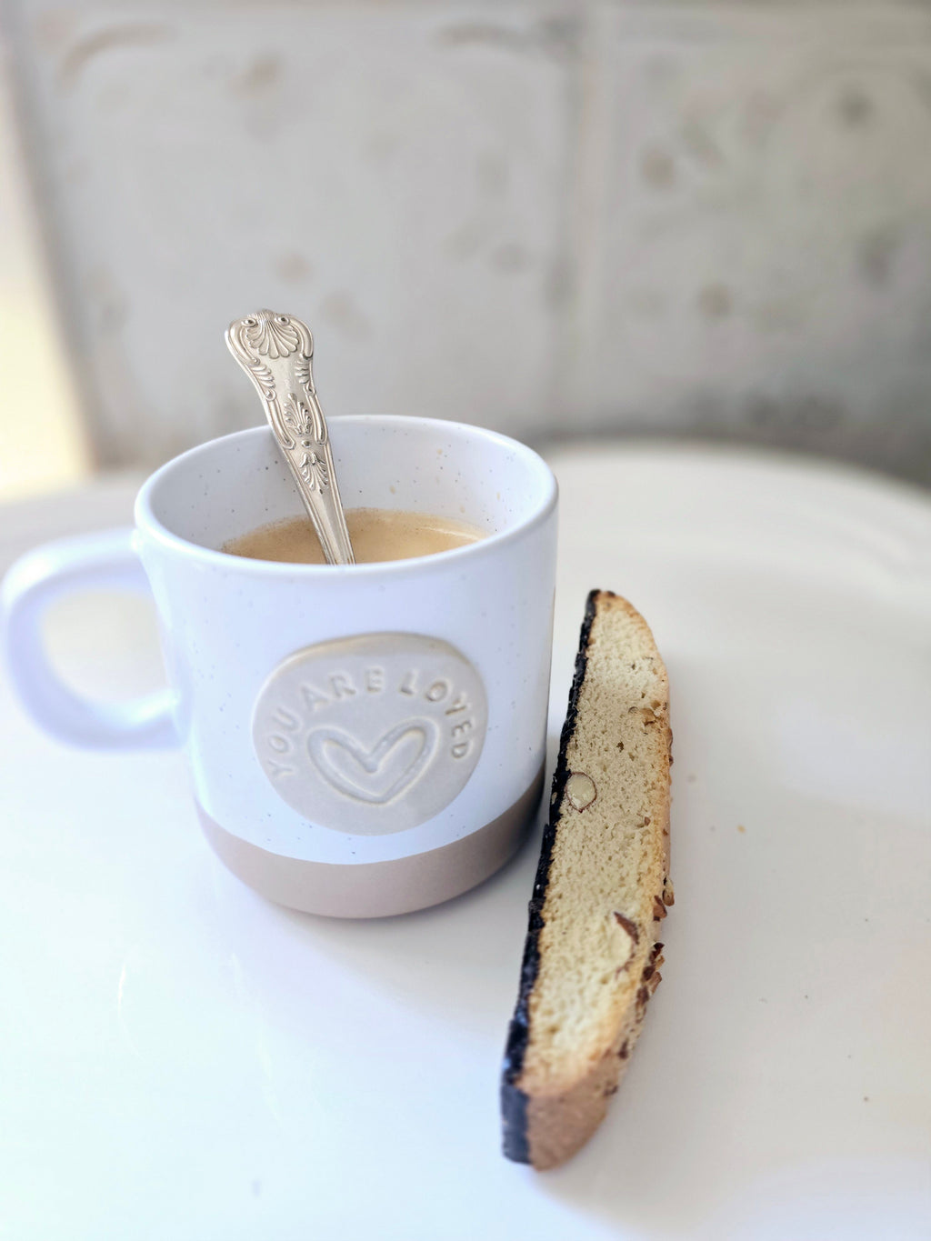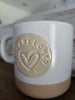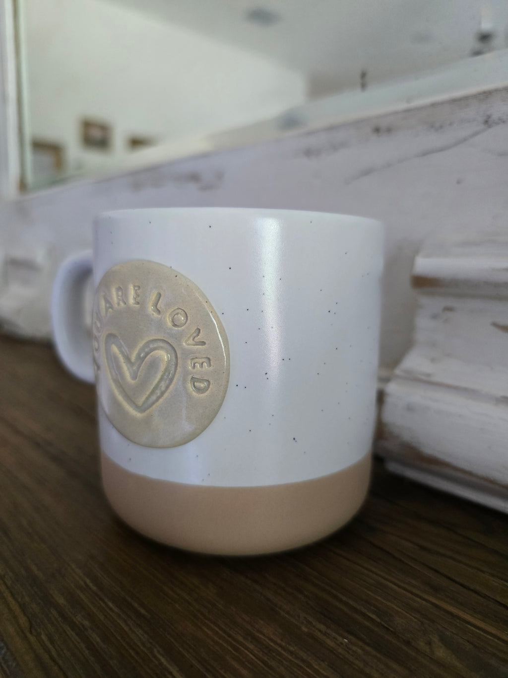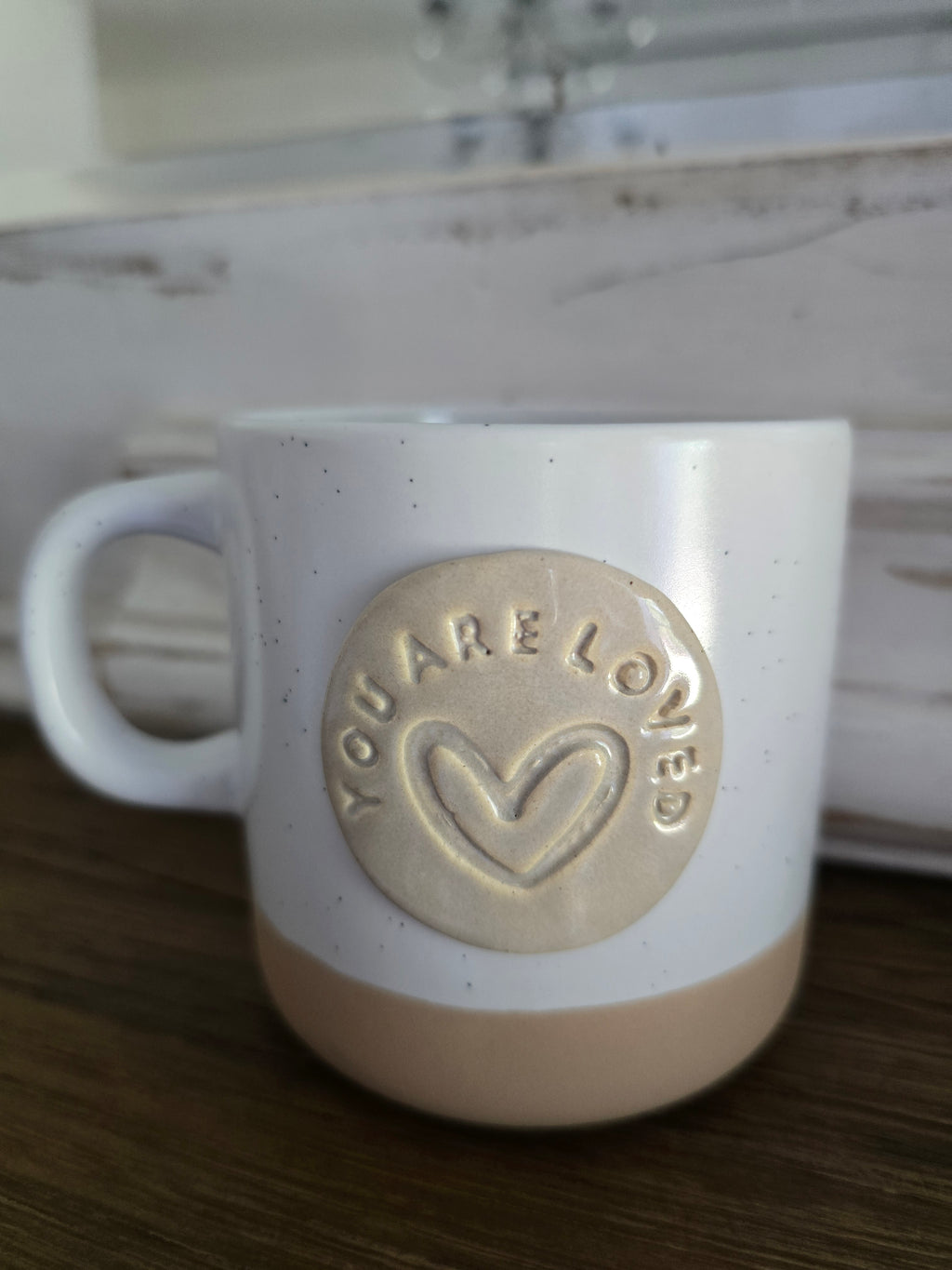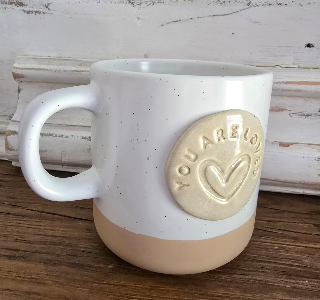 Brighten someone's day with one of these charming, hand painted coffee mugs. They are decorated with unique handcrafted adornments saying You Are Loved stamped into circular pendants and are excellent gifts for the coffee or tea drinker in your life.